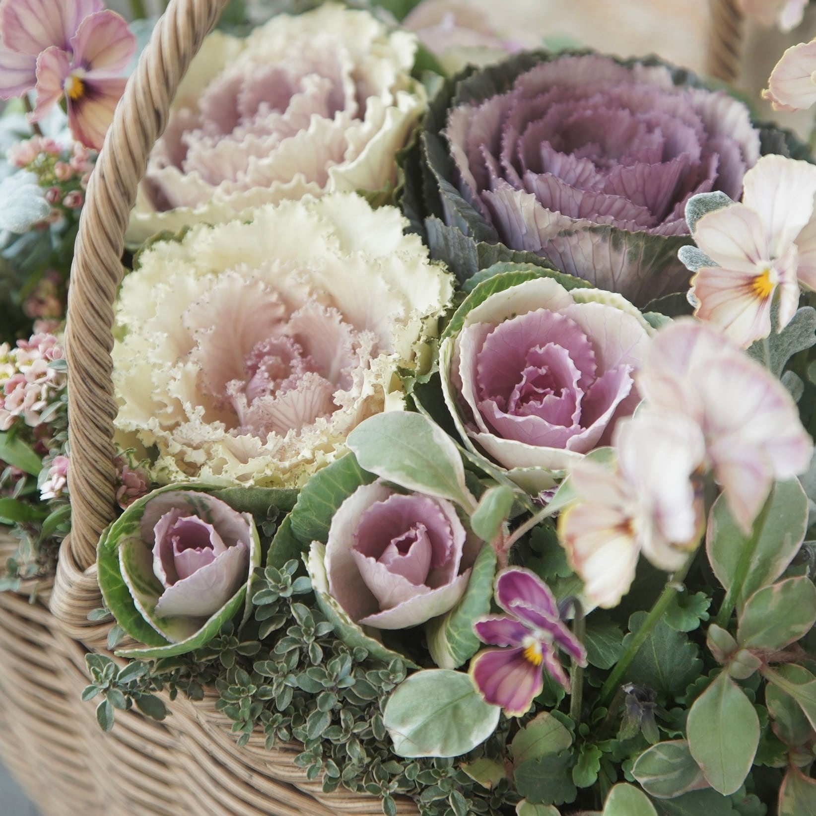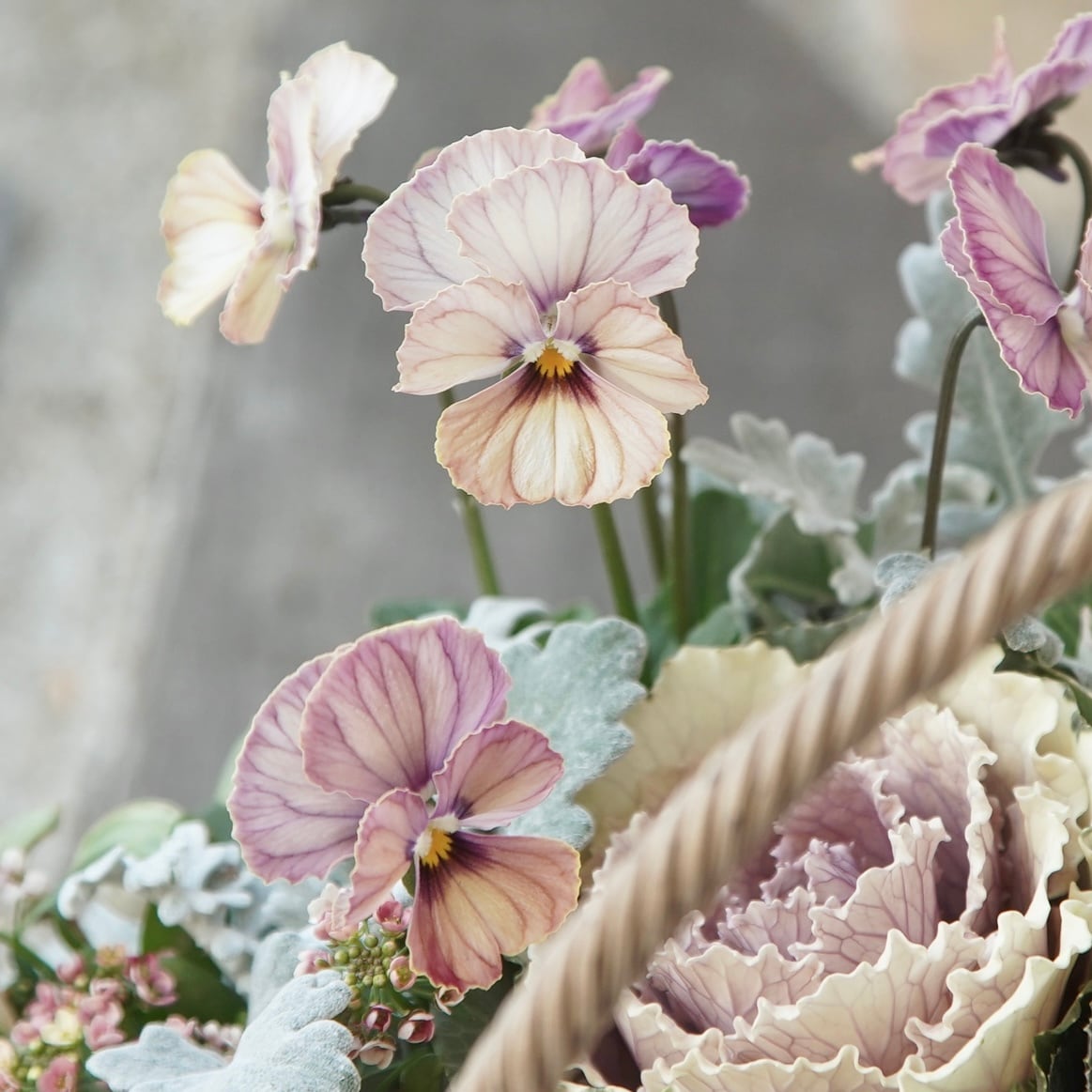 「ときめきビオラ シネマティックベインとハボタン」の寄せ植え